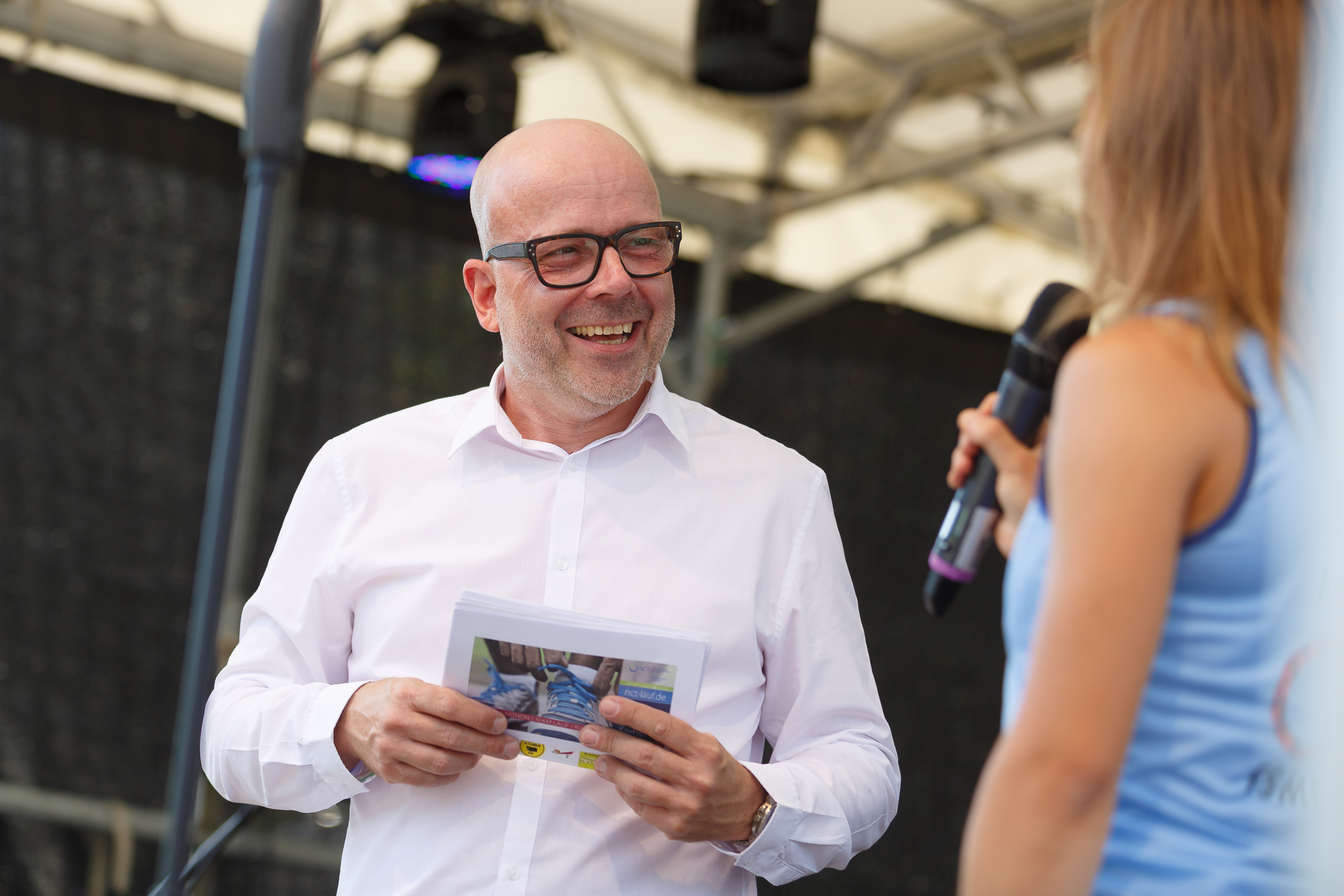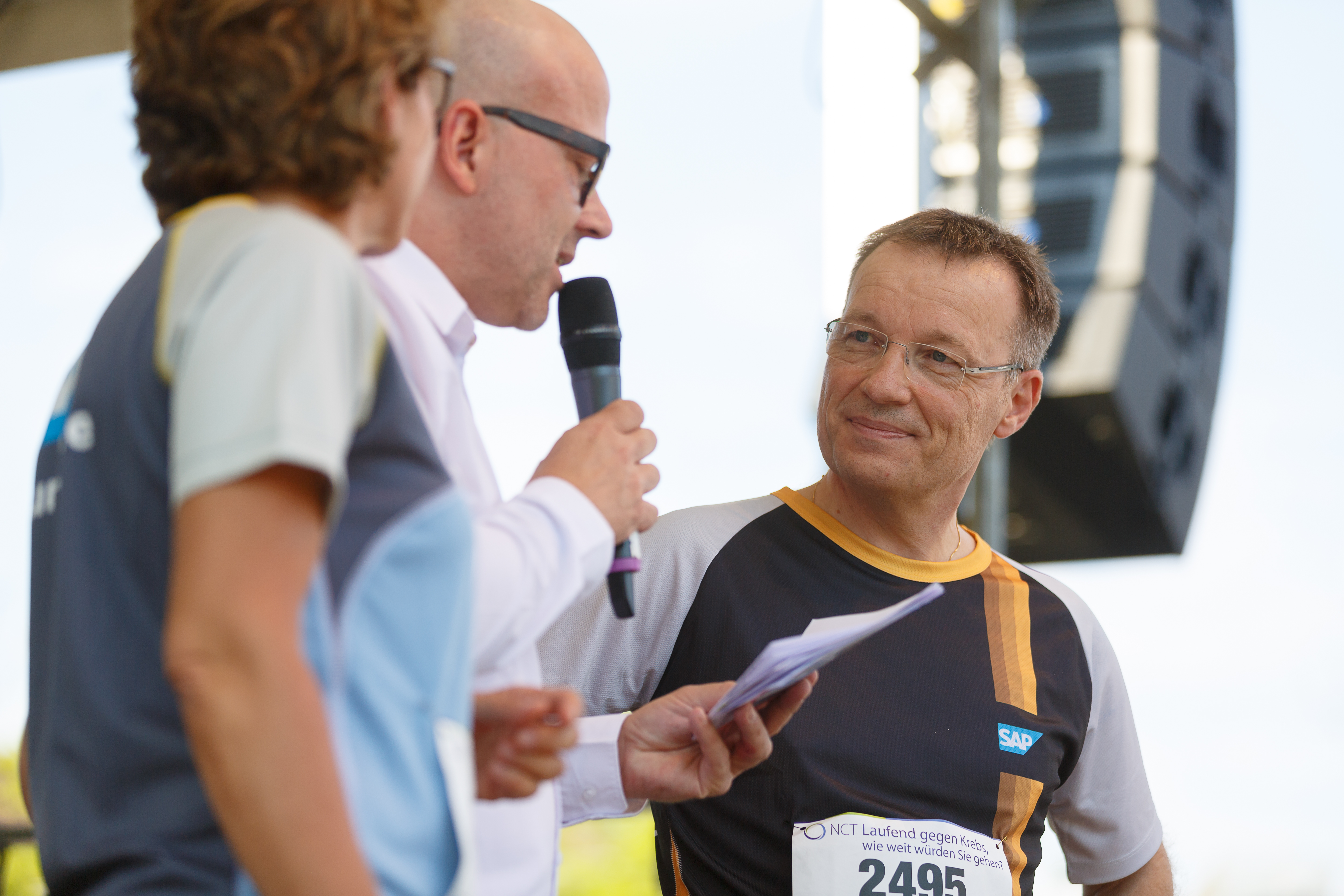 „Beim 7. NCT-Lauf des Nationalen Centrums für Tumorerkrankungen (NCT) Heidelberg am 13. Juli 2018 überzeugte Tom Haberer erneut mit seiner humorvollen und abwechslungsreichen Moderation. In diesem Jahr hatte er erstmals einen Co-Moderator für die sportlichen Details an seiner Seite. Haberer verstand es seinen Moderatorenpartner flexibel und professionell in das Bühnenprogramm einzubinden. Vor dem Start der Läufer sprach Haberer mit vier Interviewpartnern und begeisterte die Zuhörer durch seine spannende und einfühlsame Art der Gesprächsführung. Mit 5.100 Teilnehmerinnen und Teilnehmer und Spendeneinnahmen von 150.000 Euro war der Benefizlauf des NCT Heidelberg wieder ein großer Erfolg, der nicht zu Letzt auch durch die engagierte Arbeit von Tom Haberer mitgetragen wurde. Herzlichen Dank für die tolle Zusammenarbeit und hervorragende Moderation für die gute Sache. Bis zum nächsten Mal!“